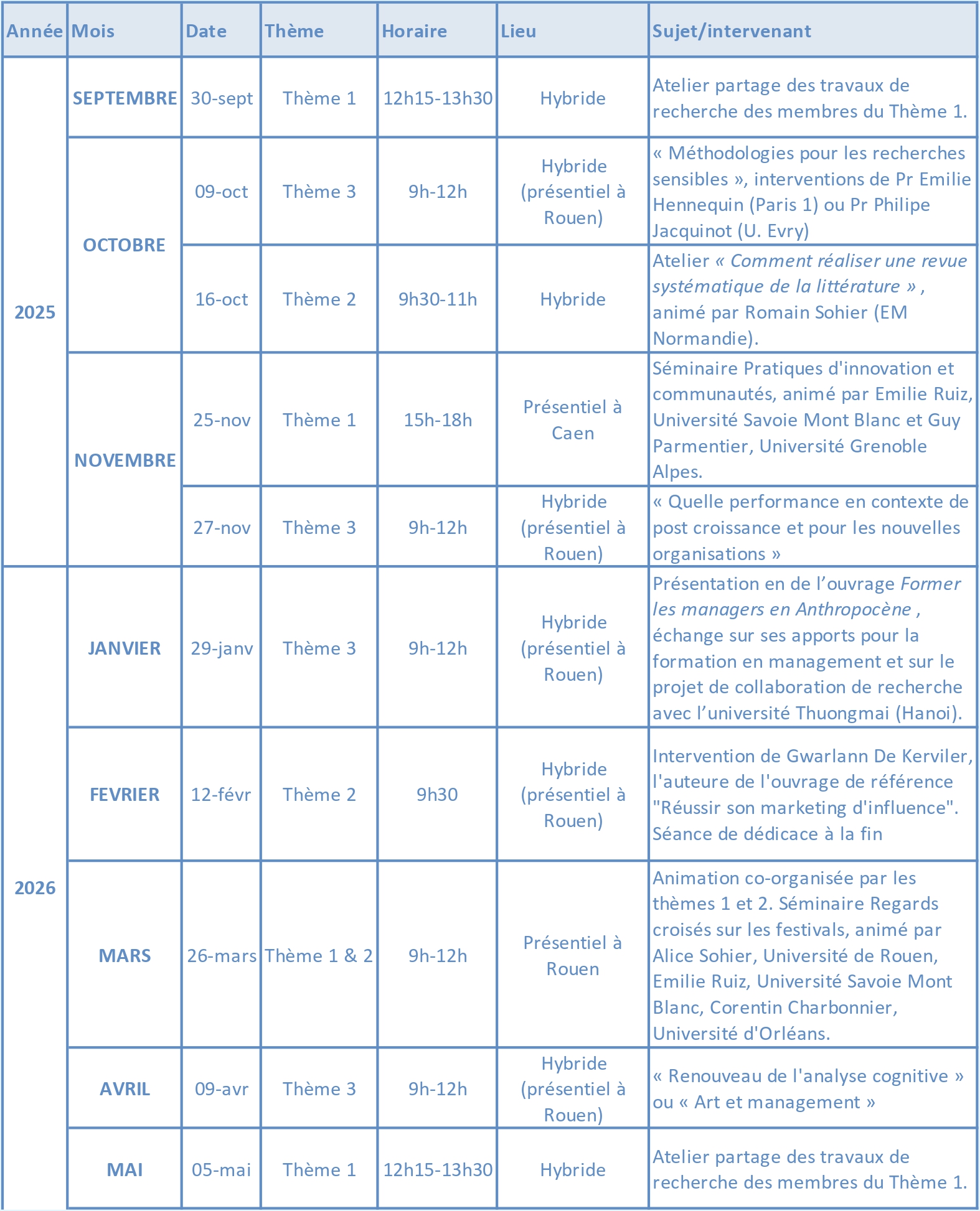 Les réunions de thème du NIMEC sont des temps réguliers d’échanges scientifiques entre les membres du laboratoire. Chaque membre est rattaché à un thème, mais reste libre de participer aux réunions des autres thématiques. Afin de faciliter la participation, un rappel est communiqué quelques jours avant chaque rencontre, accompagné, si nécessaire, d’un lien de connexion.