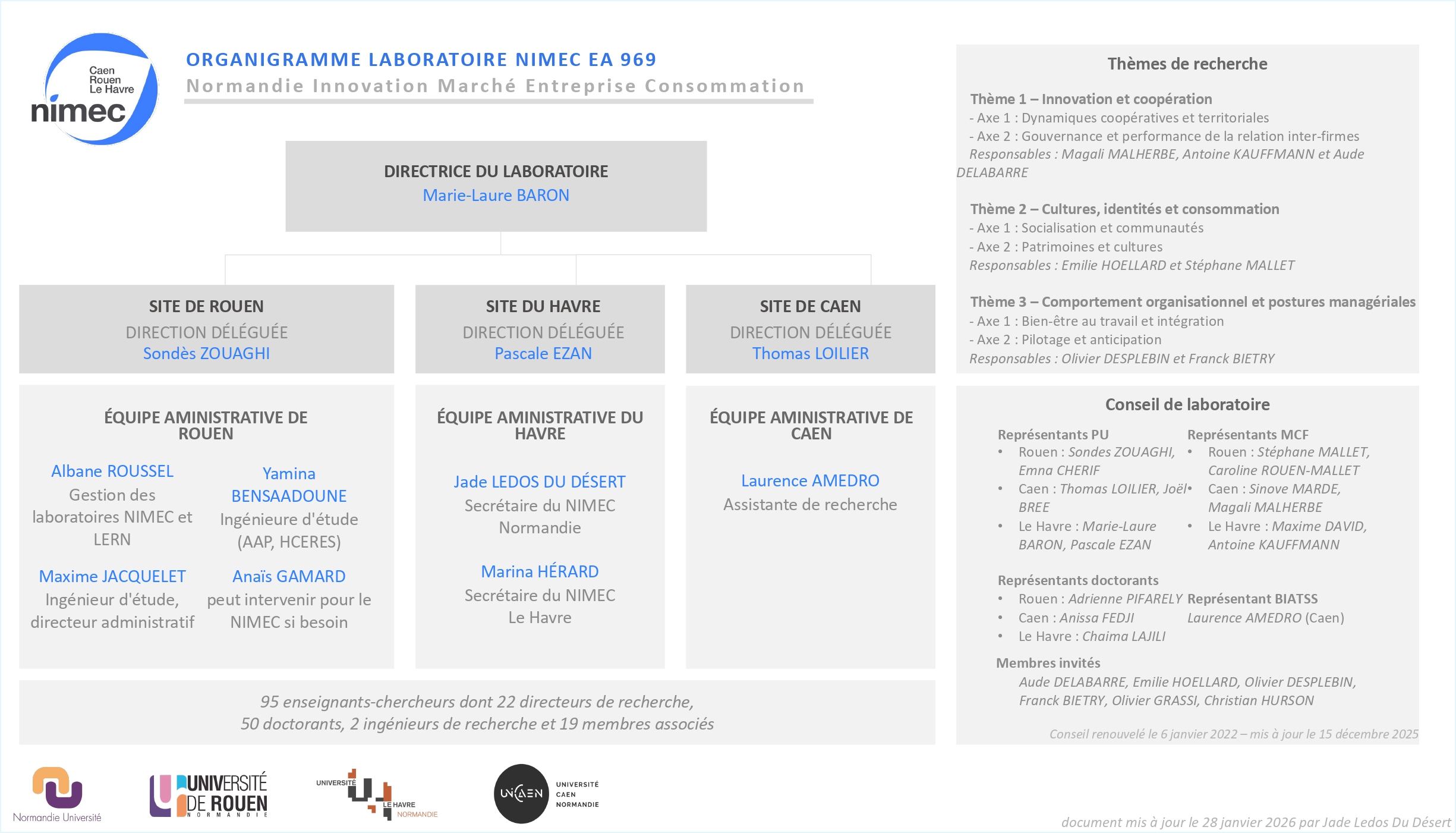 Laboratoire NIMEC UR969 Normandie Innovation Marché Entreprise Consommation Organigramme année universitaire 2024-2025 Marie-Laure BARON Directrice du NIMEC Thomas LOILIER Directeur délégué Site de Caen Sondès ZOUAGHI Directrice déléguée Site de Rouen Pascale EZAN Directrice déléguée Site du Havre